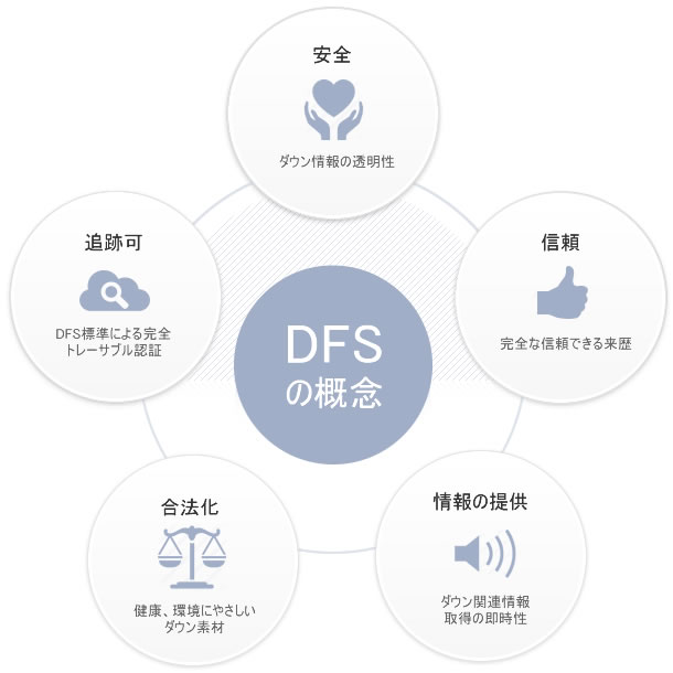 私たちは信頼できる合法的な羽毛・ダウンの追跡可能かつ情報を提供できるプラットフォームを人々やDFSユーザーに提供することで、衣服、寝具あるいは寝袋を利用する顧客すべてに、それらのダウン製品を楽しむと同時に、安全さと快適さを感じてもらえるよう日々努力しています。
